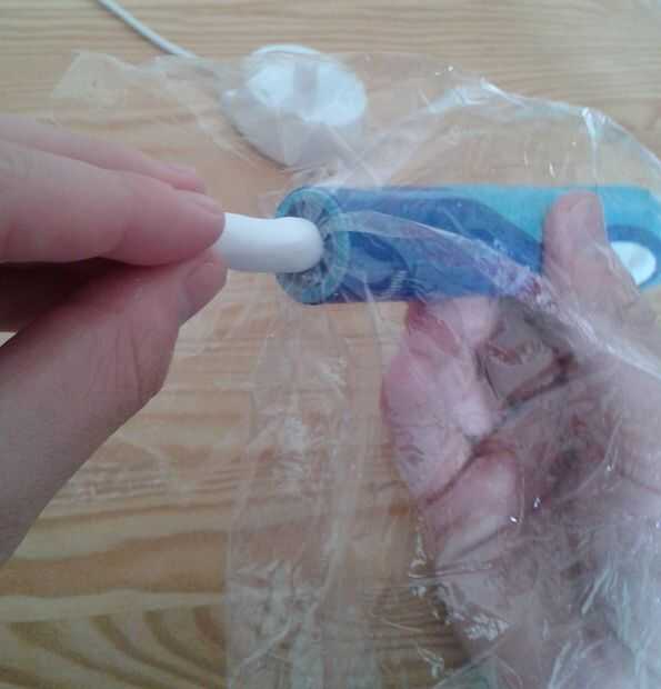 se necesita un pequeño paquete de sugru blanco para este trabajo. En tus dedos para s 30 segundos siguiendo las instrucciones del paquete hacer un chorizo largo y meter en la cavidad del cepillo de dientes de film transparente forrado...