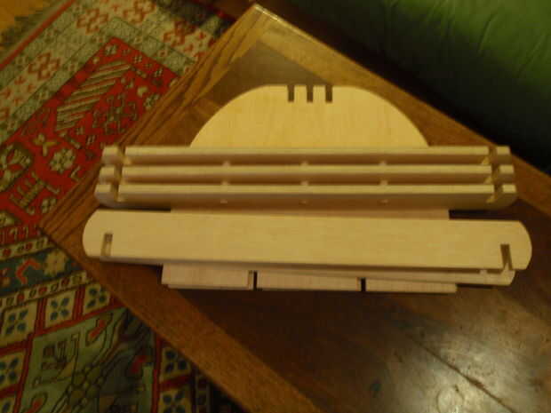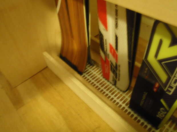 Si la parrilla no es lo suficientemente estable, intenta añadir tiras de madera adicional en el interior de los largueros inferiores para sujetar los esquís más verticales (ver foto). Tenga en cuenta que también he añadido un trozo de vinilo lluvia canal cubierta para evitar que rayen el piso.