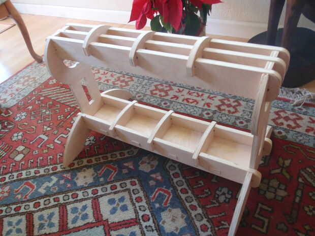 aquí es un soporte de almacenamiento de esquí que se puede construir de un cuarto hoja de madera contrachapada con un router con un plano de 1/4 o downcut poco. Usé un router CNC para corte de mina. Este soporte se puede montar y volver a montar sin necesidad de herramientas.