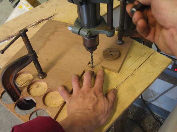 Establecer una plantilla como se muestra por lo que los agujeros están en el lugar correcto. Todo lo que ves es afianzado con abrazadera excepto los botones. Soy perforación de dos a la vez.