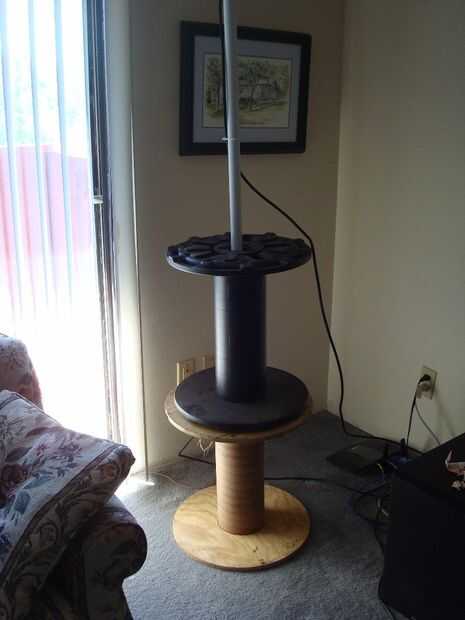 Hemos salvado un carrete de madera y una de plástico. La madera es más pesado, así como en la imagen las bobinas apiladas hacen una buena base segura para sujetar el mástil y permitiendo la rotación. Necesitábamos acortar el mástil cerca de cuatro pulgadas, sustitución de la cubierta de goma después de hacer el corte rápido con una sierra para metales.