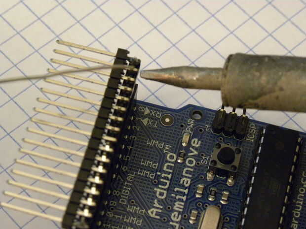 Ser muy cuidado de no conseguir ninguna soldadura en el Arduino, como una soldadura puente puede inutilizarlo.