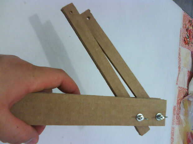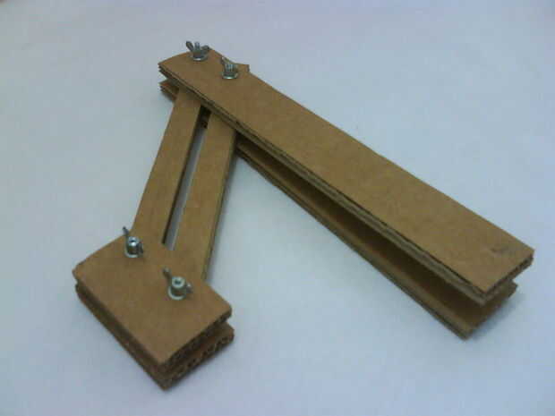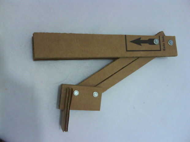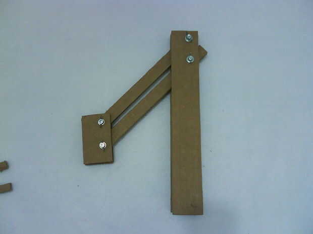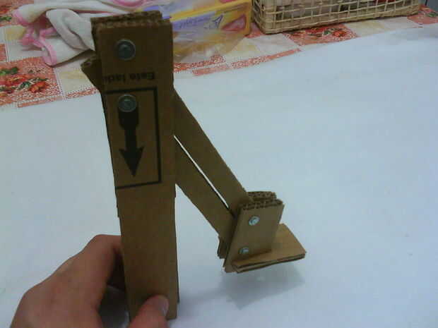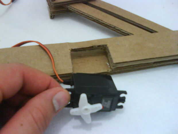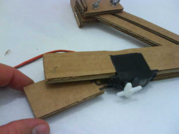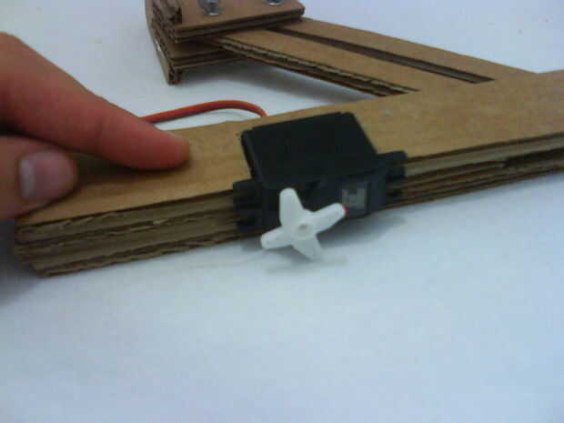 En el tallo principal del brazo articulado, poner un servo estándar que hace que el brazo de enlace a través de una pieza de metal. Este eje se reforzó con un trozo de cartón entre ellos para sostener, como la figura.