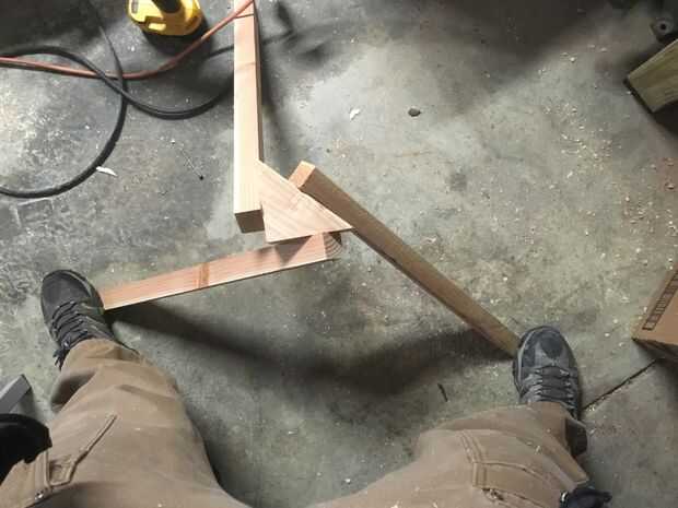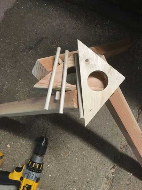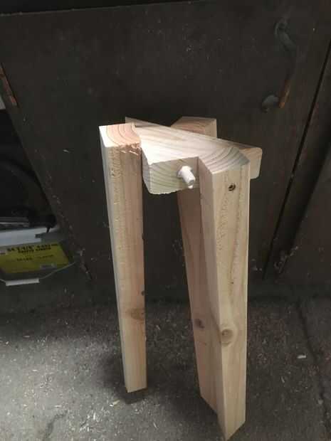 Tomar lo otros 2 x 4 x 24" y rip en la mitad. Ahora debe tener tres piezas @ 1 & 3/4". Corte la parte inferior de cada uno en un ángulo de 53 grados. Cortar un 2 x 4 de 45 grados en ambos lados, taladro 1 y 1/4 agujero en el centro y 1/4" agujeros en los tres puntos. Permanente en la parte inferior de las piernas Coloque el triángulo en la parte superior. Una vez que todos se unen lugar nivel en top 5/8" taladro en el lado del triángulo para permitir que 5/8" varilla de pasador. Se trata de dejar las patas de la mudanza fuera de lugar. Cortar un triángulo de 1 x 4 o 4 x 2, 1 y 1/4 agujero en el centro y 1/4" agujeros en los puntos del triángulo a triángulo anterior. Esto permitirá que el (3) 1/4 "x 5 y 1/2 varillas sujetar ambos triángulo juntos.