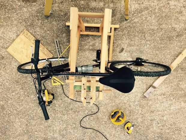 Recientemente, decidí hacer una bicicleta principalmente con el propósito de palancas y engranajes de sintonización. Estaba cansado de volcar la moto para fijar el engranaje debido a dos problemas: 1) tienes que llegar a cuatro patas a girar la rueda y 2) que duro al trabajo en bicicleta invertida. Por lo tanto, he creado un soporte de bicicletas para arreglar mi bici sin todas las molestias. La estructura es toda la madera, no metal necesitada. Yo alternaba entre clavos y tornillos de cabeza Phillips al fijar el marco y los soportes. Las dimensiones son 3' x 3' x 4,5' (solo altura suficiente por lo que me puedo sentar en una silla al girar los pedales). Con este soporte de bicicleta, puede arreglar bicicletas con facilidad. Ahora todo lo que necesito son algunos sostenedores de taza.