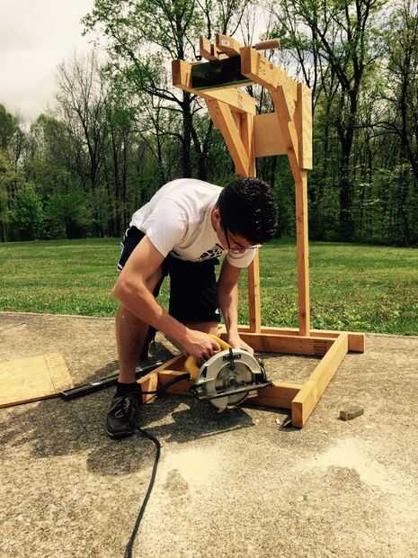 Para iniciar este proyecto, te aconsejo trabajar sobre una superficie plana por lo que su base no va ser sesgada hacia ningún lado. Además, protección para los ojos se recomienda este proyecto. Tiempo para empezar. Medida de cuatro piezas de madera en 3' por pieza. Las piezas se unen por lo que dos lados están empotrados en la Plaza. Añadir una quinta parte (aproximadamente 3.5-4') sobre la parte exterior de uno de los extremos retraídos. (Véase el cuadro de distribución) Luego, añadir dos trozos de madera en la ranura estrecha que se extenderá desde la base aproximadamente 4.5' hacia arriba (la parte posterior del soporte). En la parte superior de la madera, unir otro dos trozos de madera que jut hacia fuera 3-4' y mantener la moto sí mismo (los brazos del soporte). Para acabar con la base, la base del soporte está ahora completa.