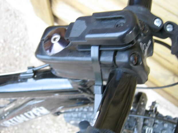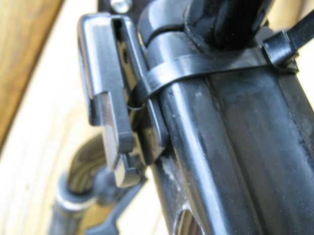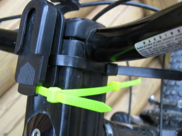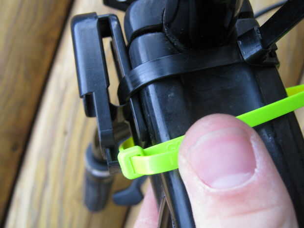 Apriete una amarra por debajo de la ballesta de la pinza y otro por encima (ver fotos). Esto Fije el clip de la correa al manillar y evitar mover hacia arriba o hacia abajo. Se podría también usar epoxy, pero quería el cinturón ser extraíble. No clip al atar zip por ahora, como usted puede decidir reposittion el clip.