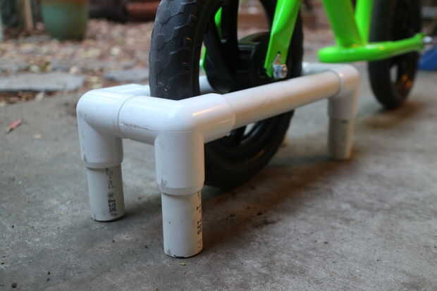 con todas las piezas de extensión PVC insertadas la cadena de la bicicleta puede ser unos 40" sobre la tierra, a esta altura es necesario un soporte lateral.Atar el tubo vertical a algún poste, pared etc..Paso 1: Las partes Todas las piezas son de PV