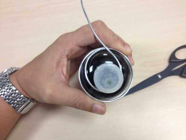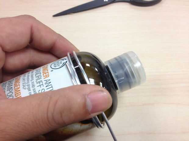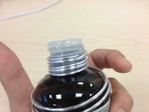 a continuación, mueva la bobina a la parte de la botella donde comienza la curva y ahora continuar enrollar el alambre alrededor de la tapa (aproximadamente 5 veces es fino). Cortar el hilo después de hacer esos 5 o 6 vueltas alrededor de la tapa y presionar contra la tapa.