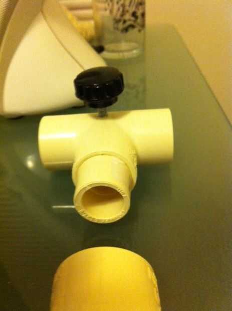 Perforar un agujero en el empalme en T. Uso un poco lo suficientemente pequeño como para que puede aprovechar el agujero con el tornillo. Coloque el agujero sobre la parte "larga" de la T apretará el tornillo en el brazo de micrófono cuando el soporte está montado. Atornille el tornillo en el agujero. Tuve que usar una llave en el tornillo de mariposa suficiente apalancamiento para aprovechar el agujero al principio.