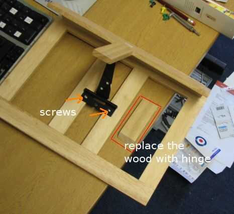 Ahora quite el pequeño pedazo de madera que mantiene el soporte en un determinado ángulo. En mi stand fue sujetado por un par de primavera. Reemplazarlo con la bisagra de metal. Trate de experimentar con la altura que usted necesita antes de arreglarlo.