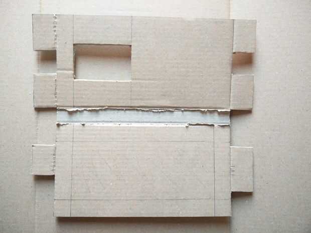 La segunda parte es un poco más complicada. Usted puede pensar en incasing tu smartphone con la cartulina y agregando 2 puntos de pivote en el lado de los orificios de la base. Intente colocar horizontalmente las olas de cartón. Es posible hacerlo verticalmente sino que hará más difícil hacer los puntos de pivote. Abra el cartón que las aletas de la pantalla justo después de que doblaron el lado y el suelo. Quitar este pedazo grande de cartón hace más débil y será alta curva probablemente en el lugar equivocado.