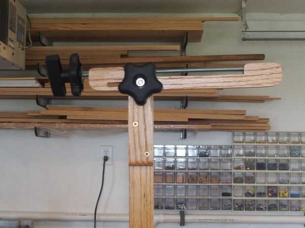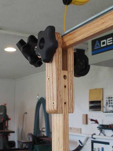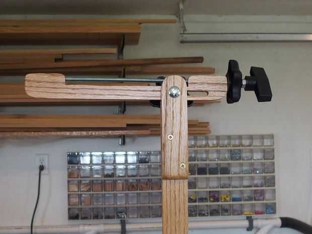 El diseño del brazo de cámara se basó en la necesidad de extender, inclinar y proteger la cámara con rosca estándar de 1/4-20. Mi solución fue cortar una varilla lista y espacio muy apretado agujero longitud algunas maneras a través del material de 3/8". Corte el brazo específicamente para hacer más fácil la perforación. El botón T y pomos de estrella son estándar del estante 1/4", yo tengo la mía en Woodsmiths. La perilla T es locknuted a la varilla lista y se usa para atornillar la varilla en la montura de la cámara cómodamente. La perilla de estrella entonces está apretada contra el extremo del brazo que tira apretada contra el brazo de la cámara (Asegúrese de que la cámara esté nivelado centrando los pies en el visor de la cámara.