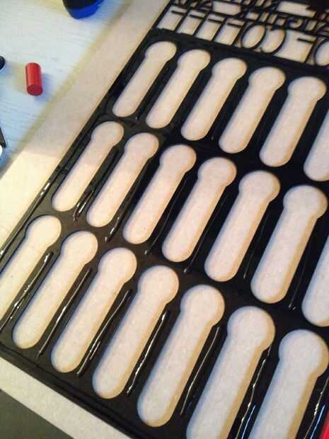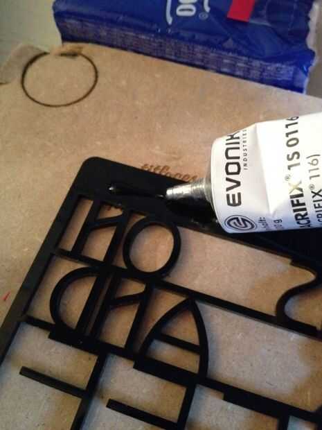 Aplique el pegamento en cualquier forma que desee, pero no uso excesivo el pegamento. La parte de letras, sólo puse pegamento en barras horizontales porque usted no puede limpiar las manchas de pegamento y con este corte fino es muy difícil no hacer manchas.