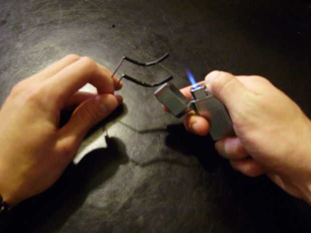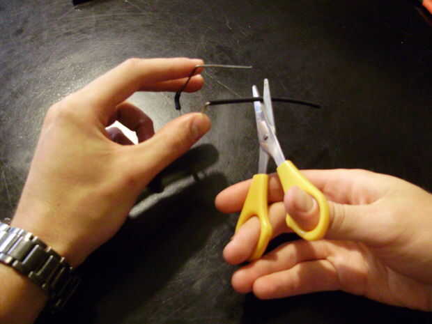 Vuelva a aplicar el corte dos pedazos de calor retráctil tubo (como se ve en la figura 6). Puede haber algunas torceduras en la tubería cuando se aplica, pero no te preocupes va a salir en el proceso de encogimiento de calor. Justo como antes, use el encendedor o calor pistola para la tubería del encogimiento con cuidado hasta que se ajuste cómodamente. Mantenga la llama en movimiento para evitar sobrecalentamiento del material.