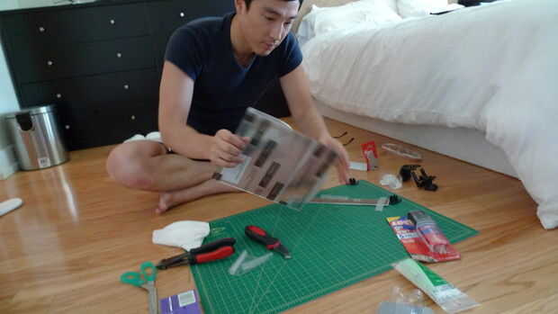 -Colocar cinta de papel alrededor de plexiglás para mantener la posición y corte plexigass con un cuchillo del inyector.