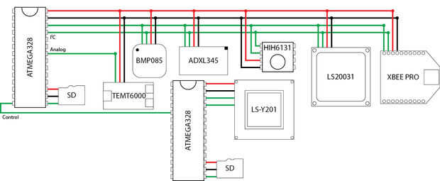 El sistema utiliza el controlador principal para recopilar datos de todos los cuatro sensores y GPS y transmisión de información inalámbrica. Estos datos se analizan y luego almacenados en una tarjeta micro SD. La cámara de LS-Y201 se controlará mediante un microcontrolador secundario. El controlador secundario utilizar una segunda tarjeta micro SD para almacenar las imágenes recogidas. Una línea de control permitirá que el controlador principal indicar el controlador secundario para recoger una imagen. La arquitectura del sistema ha sido ilustrada aquí.