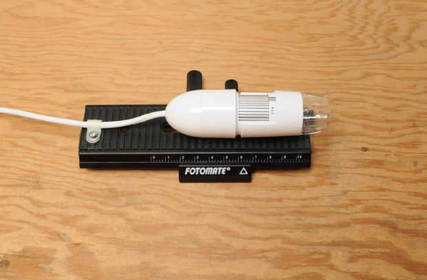 Coloque el microscopio de modo que se extiende más allá del extremo del riel de enfoque por cerca de 3/8 de pulgada. Que permitirá el microscopio al moverse tan cerca como sea posible a la muestra sin golpeando. Asegúrese de que el mando de enfoque en el ámbito de aplicación esté lejos de la baranda.