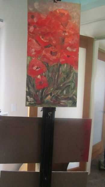Usé clips binder de tamaño medio para 'colgar' las tablas de arte que 'colgaron' en los pequeños clavos que yo previamente había golpeado ligeramente en la bolsa vertical. (Estoy usando sub cita aquí, como no quiero a nadie pensando que este tipo de "colgar del cuadro" es la misma como de arte enmarcada en una pared que cuelga. La premisa es la misma excepto usando materiales de montaje/colgante de pared diferentes). Uno por uno, los consejos fueron colocados en el stand y listo, un stand hecho a mano diseñado y construido para satisfacer las limitaciones de un show artístico particular!