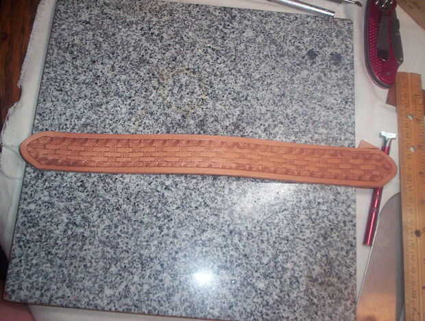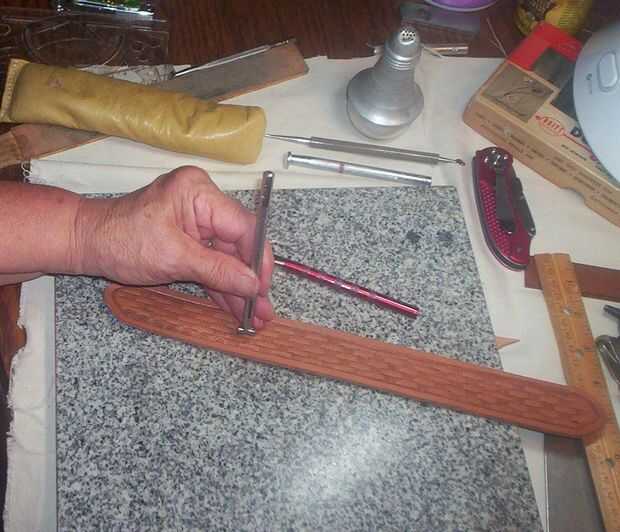Coloque la herramienta de la armadura de cesta en la línea de biselado, asegurándose de que toca la línea con todo el filo de la herramienta. Con el mazo, dar un hit.so firme que usted tiene una impresión clara. Tome la herramienta y colocar las líneas sobre la herramienta en las líneas finales de la primera impresión. Inclinación del borde superior de la herramienta y hacer una ligera impresión con la línea superior de la herramienta. Esto ayudará a mantener el diseño recto. Ahora ir en el borde superior de la última impresión de la herramienta y la marca hecha y realizar la impresión siguiente. Ahora regresa a la línea biselada y coloque la herramienta en el fondo de la impresión superior y hacer otra impresión. Puede continuar este proceso para finalizar las dos primeras líneas, o acumularse en el borde superior del proyecto. Al llegar cerca del borde superior del proyecto, asegúrese de que no se traslapan con la línea biselada. La herramienta de frontera cubre áreas pequeñas no.