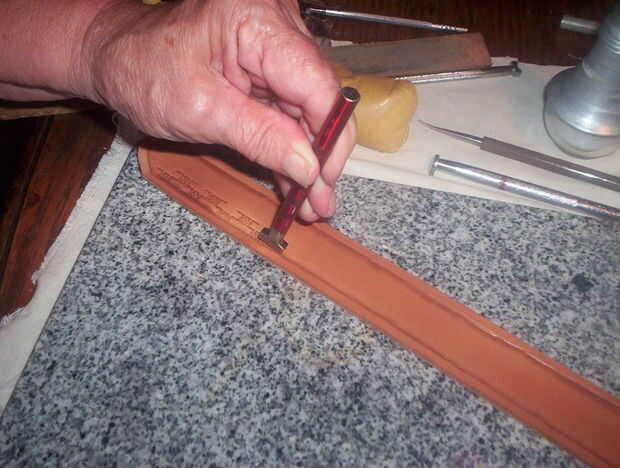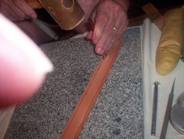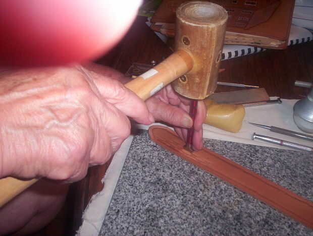 Tome la herramienta de frontera y en cada esquina o en el cruce de la parte recta y redondeada, asentar el borde en un ángulo. Esto evitará un extraño lugar abierto en esos puntos. Coloque la herramienta a lo largo de la línea biselada y golpear firmemente la herramienta con el mazo. Seguir todo el proyecto.