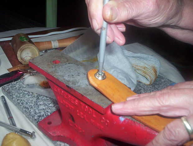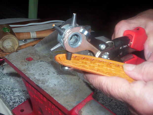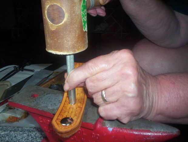 Tome el cinturón que se utilizará con el soporte para tubos y ahora bastante abajo el proyecto que permitirá que el cinturón se deslice a través de la pantalla soporte y marca ese punto. Encontrar el tamaño del agujero que necesitará para el vástago del remache y ponche a través de dos piezas de cuero. Ponga el vástago del remache a través de dos piezas de cuero y la cabeza del remache en la zona cóncava del compositor. Agregue el pedazo restante del remache y usando el setter del remache. Tome un poco fácil - en otras palabras no en slam.