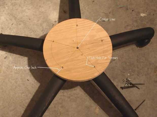 Para orificios guía de 1" de borde de la marca. Taladre los agujeros un poco más grandes que el diámetro de los tornillos de la cubierta. La cabeza del tornillo no debe deslizarse a través de la madera contrachapada.