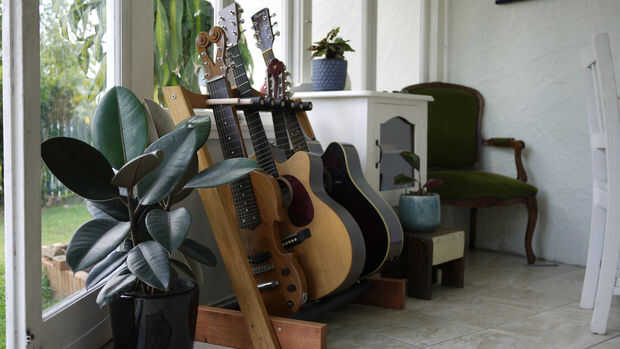 Comprar un sofá modular que se llevo a cabo la "esquina de guitarra" me estimuló en la planificación de la acción y comencé investigando soportes de guitarra. En nuestro último lugar habíamos hecho un gancho de guitarra que se atornilla en la pared. Lamentablemente nuestros agentes de alquiler no son grandes fans de poner un montón de tornillos en las paredes y así que tuvimos que buscar en conseguir uno libre.