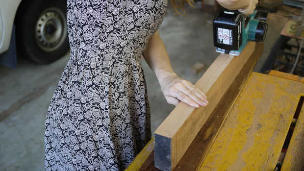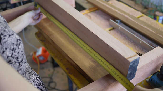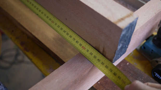 Usé otra pieza de 2 x 4 para ser mi pieza Puente de cuello y corte a 680mm había trabajado hacia fuera que aproximadamente 150mm por guitarra era una buena guía y luego añadiendo 40mm cada lado para permitir que los pies de ancho me dio la longitud que necesitaba.