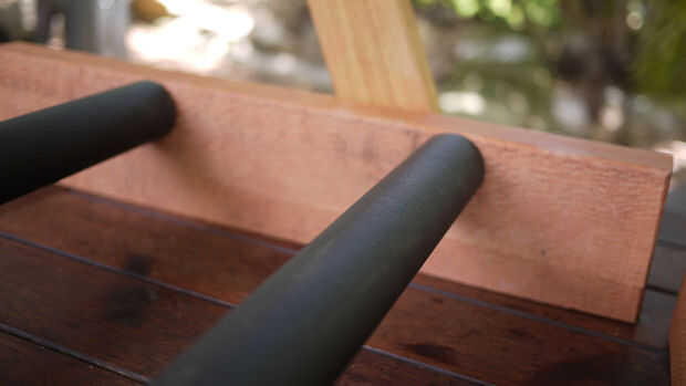 Las barras en un lado de la base primero, deslice la espuma y luego pegar las varillas en el otro lado. Debido a la broca dejó una marca en el exterior de las piezas base, sabía exactamente dónde perforar y poner tornillos de acero inoxidable en para sostener las varillas.