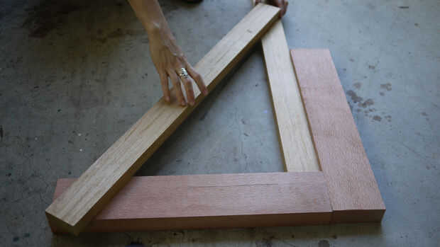 Para calcular la posición de las piezas vertical y el ángulo que quería cortar, puse mis dos pies piezas para usar como una cuadrado y utiliza una pieza vertical para indicar que la madera le pegaría a la pared, la otra pieza vertical de ajuste hasta que tuviera el ángulo y la altura que quería.