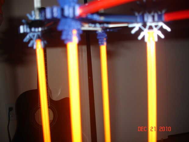 este es un soporte de guitarra múltiples que construí recientemente. Tiene 2 guitarras acústicas, un ukelele y hasta 5 guitarras eléctricas al mismo tiempo. Está hecho completamente de madera y aislamiento de la pipa de espuma. (De momento) sólo teng