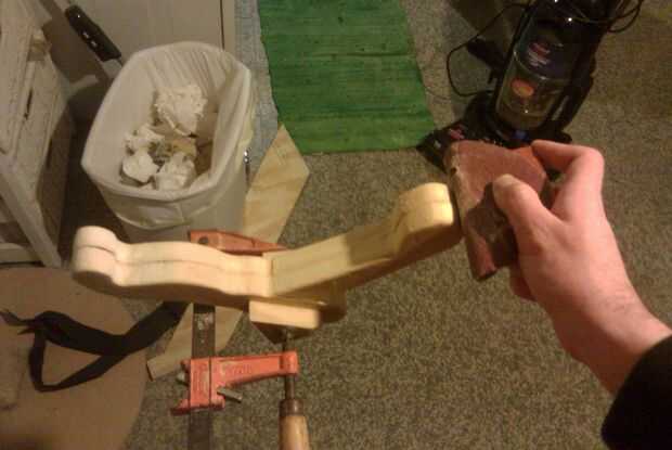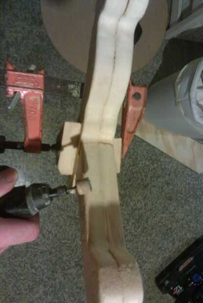 Después de que la madera es rugosa hacia fuera es hora de busto la herramienta vieja confianza de Dremel con el accesorio lijadora de tambor. Utilice el Dremel para suavizar las zonas desiguales. Luego volver sobre él a mano con un bloque de lijado asegurándose de llegar desde todos los ángulos. Una vez que has logrado una cantidad razonable de suavidad en la forma puede rastrear las formas en otro pedazo de madera y repetir los pasos hasta este punto. Ahora que ya tenemos cuatro piezas de madera (2 patas arriba y 2 abajo piernas) podemos pegar las piezas juntos haciendo dos piernas separadas de las piezas. Cuando las piezas están conectadas es una buena idea para sujetarlos juntos y pasar un par de veces más con el papel de la arena para asegurarse de que las formas son constantes.