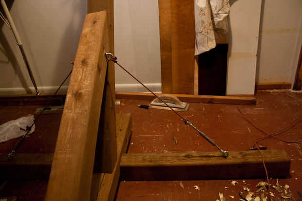 Para una mayor estabilidad, el tensor debe se han conectado a la viga vertical principal, en un punto más alto. Esto significa resbalar la estabilización de la viga más hacia el exterior. No lo hice, porque pensaba que impediría con muebles en mi sala de estar. Resulta que no, y que podía tener. Hasta ahora ha sido lo suficientemente estable como para no preocuparse.
