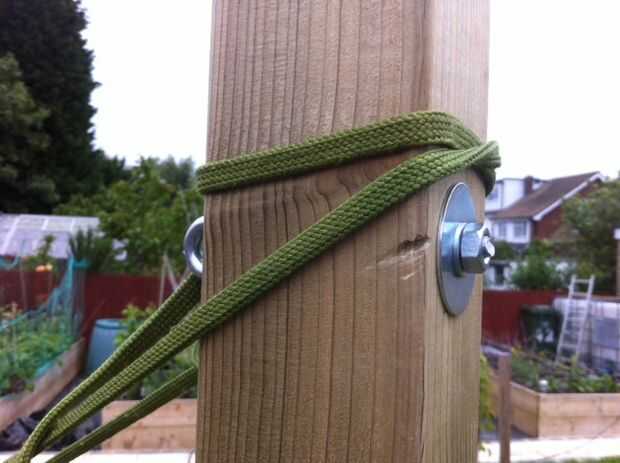 Perfore un agujero de 10mm, a través del perno de ojo y utilice la arandela y la tuerca. Se puede ver en el a continuación he utilizado una arandela 2 º - esto era para distribuir el peso de la madera tanto como sea posible. La arandela grande se llama una arandela de reparación.