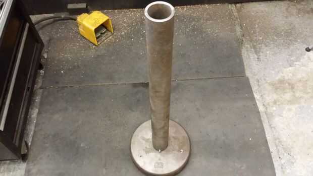 Hecho de dos pesas de 25 libras y un trozo de tubería de pared gruesa.