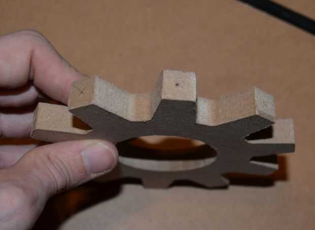 En este punto también se deben perforar los orificios para los tacos que se utilizará para dar la altura del soporte. He utilizado cinco clavijas ya era el divisor menor de 10 (el número de dientes) que no fue 2 (que no hubiera ninguna fuerza). Perforar al menos un cuarto de pulgada de agujero central. Asegúrese de que los agujeros son todos uniformemente espaciados para que los tacos sean paralelos una vez que la parte superior e inferior están montados. Estos orificios deben ser del mismo tamaño que su pasador. Prefiero no hacer todo el camino a través de las piezas con el fin de tener una superficie limpia en la parte superior, así que usé un indicador de profundidad en mi broca para decirme cuándo había perforado hacia abajo 1/2"(dejando 1/4" de mi 3/4" material perforada)
