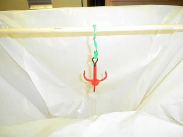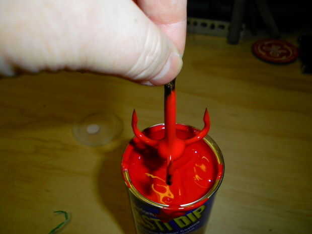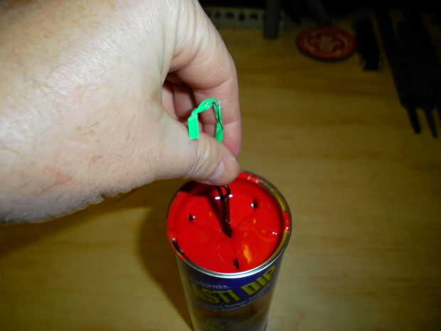 El gancho con el Dip plástico la capa impide la oxidación del gancho, hace más fácil de ver desde la parte superior del soporte y también ayuda a evitar el gancho de dañar lo que está recuperando. Mezclar/revolver el Dip plástico según las instrucciones del envase. Sumerja lentamente el gancho en la inmersión hasta la profundidad deseada, entonces quitan lentamente de la inmersión en la misma proporción que estaba sumergida. Cuelgue el gancho del ojo con un pedazo de alambre, un clip, etc.. Me Coloque un pasador pequeño sobre un bote de basura y cuelgue el gancho a partir de ahí hasta que se seque. Normalmente puede manejarse en unos 30 minutos y se puede volver a sumergido. Yo generalmente sumergir el gancho por lo menos dos veces para darle algún bulto. Se curarse completamente en unas 4 horas. Utilice el cuchillo para quitar el curado por inmersión de la cara del imán como hiciste con el epoxi.