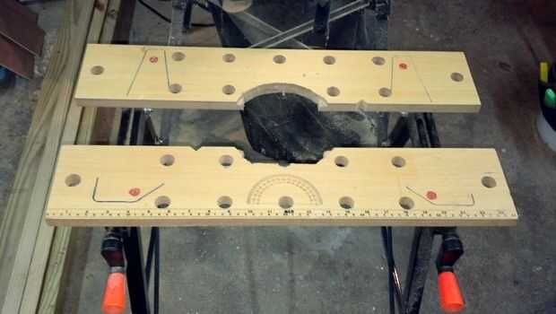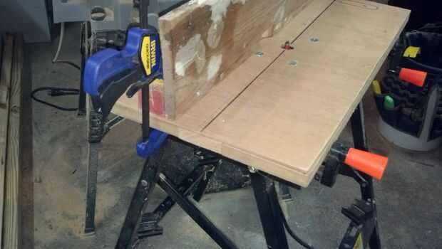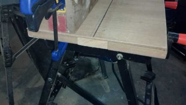 Tomé un pedazo de un antiguo jamba de la puerta y corte a la longitud de la mesa. Que poner algo de madera masilla en los agujeros y arena suave. Atornillado una pieza de 2 x 2" en la parte trasera que me diera algo para el pie y sujetar a la mesa. Al principio usé algunas abrazaderas de tipo C grandes, pero ahora utilizo algunas abrazaderas de agarre rápido para sujetar la valla hacia arriba.