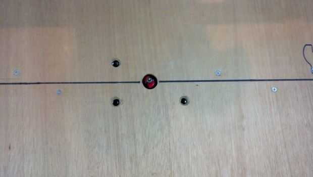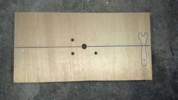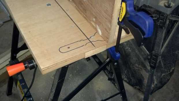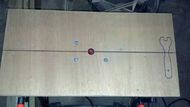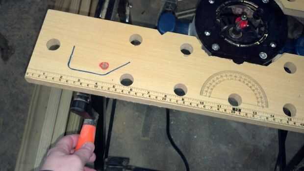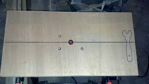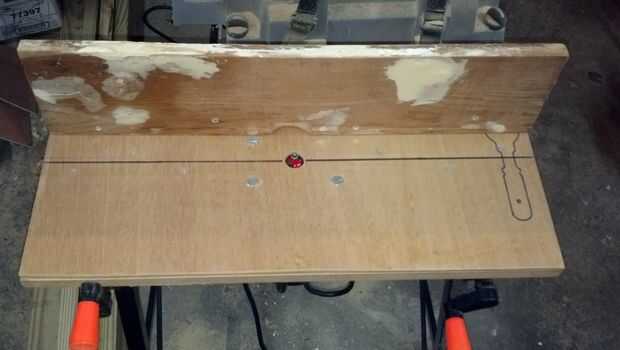 Taladré un agujero en el tablero de la mesa para la broca de fresadora y luego dibujé una línea central para ayudar a alinear la guía.