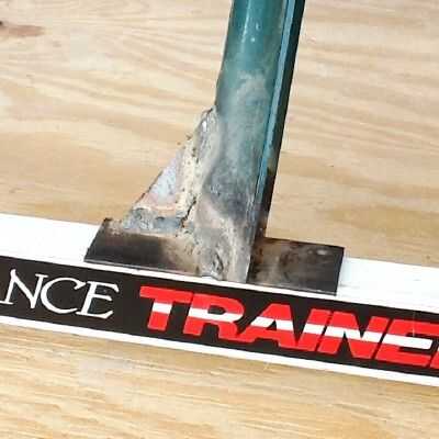 De medida entre los ejes de la bicicleta pude avistar sobre dónde serían los extremos de las horquillas. Yo ya había soldado los extremos superiores de las secciones de poste de cerca juntos para hacer una "V" invertida. Me Coloque la "V" invertida en las piezas del bastidor, se inclinó hacia delante sobre el derecho, y la tachuela soldada con autógena invertida "V" a las piezas del bastidor. Cuando era cierto que tenía lo que quería, terminé las soldaduras.