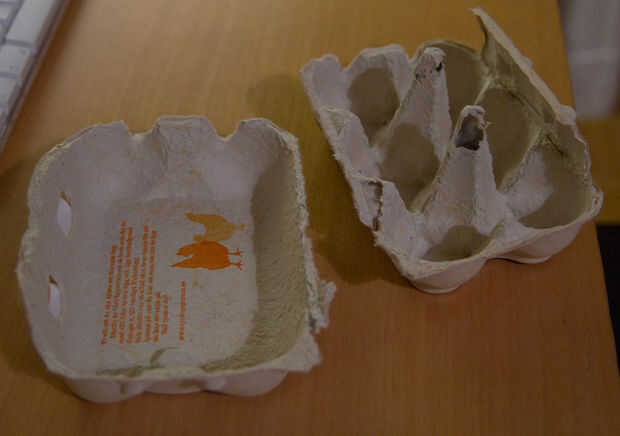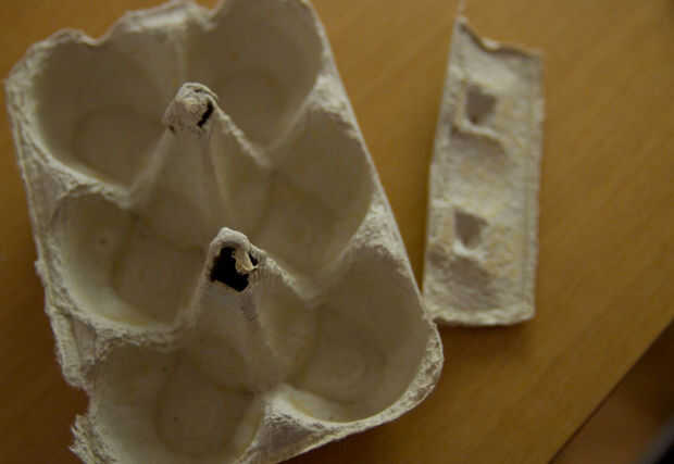 El soporte funciona mediante el uso de las "clavijas" en la parte inferior de la caja de cartón de huevo como apoyo a inclinarse contra. La amplia base de la caja ayudan a prevenir el soporte caiga. Sólo necesitamos la parte inferior de la mitad de la caja y puede cortar el resto de.
