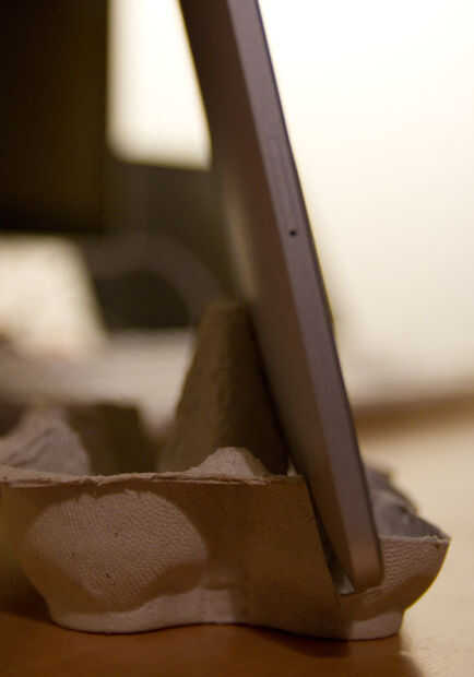 Debe ser capaz de sostener su iPad ambos de pie y en modo de retrato. Pero supongo que el diseño de cartones de huevos puede variar así que un poco ten cuidado la primera vez que usted pone iPad en el soporte.