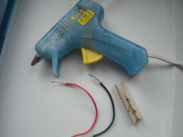 Primero, reúna los suministros. Se necesita: Mini pinza para la ropa, dos cables y una pistola de pegamento caliente.