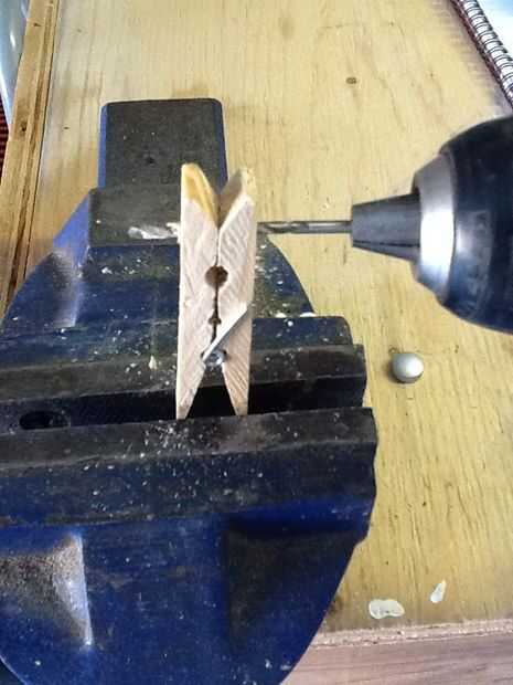 Perfore un pequeño agujero directamente a través de ambas piernas en el extremo de la pinza para la ropa.