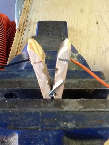 Tira sobre 2"(50mm) desde el extremo de cada trozo de alambre. Abrir la pinza para la ropa. Empuje el cable desnudo a través de un agujero y envolver todo el camino alrededor de una pierna de la clavija. Hacer lo mismo con el otro cable pelado y la pierna.