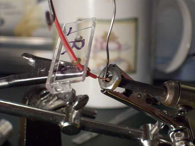 Alimentar un alambre por un extremo en el terminal positivo. Enrolle el cable alrededor de la tuerca de un par de veces y la soldadura a sí mismo (en la foto, primero traté de soldar el cable a la tuerca. No funcionó. Deje suficiente cable para que puede adjuntar a cualquier proyecto para un positivo terminal. Para el otro, dejar lo suficiente para conectar al negativo terminal de la otra batería. Utilice un pequeño de caliente pegamento en cola esto en el lugar.