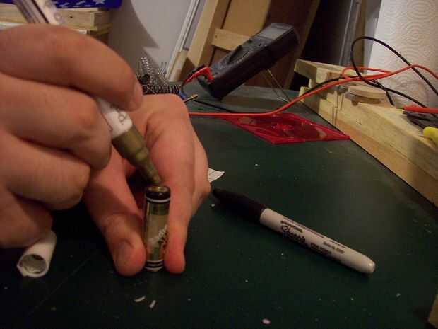 Para encontrar el centro de los terminales, dab terminal positivo de la batería con la pintura (puede una batería descargada). Seco forma un extremo en el soporte y presione una batería en lugar de transferir un poco de pintura. Hacer esto dos veces para cada batería. Perfore un agujero lo suficientemente grande como para alimentar un cable a través de cada marca. Usé una Dremel con una broca de diamante fino punto hacerlo.