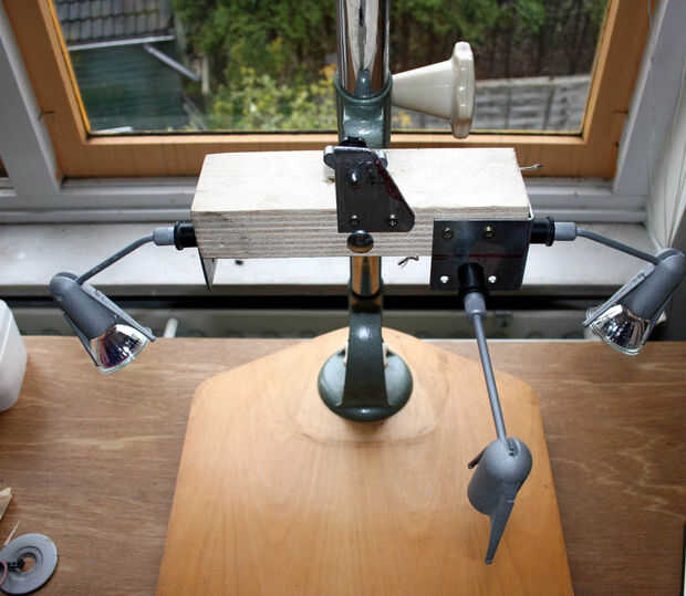 Luces en ambos lados y en frente en la parte inferior del bloque de madera, el soporte para la cámara en la parte superior en el medio.