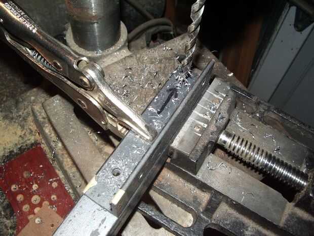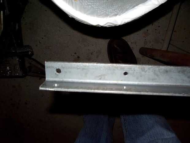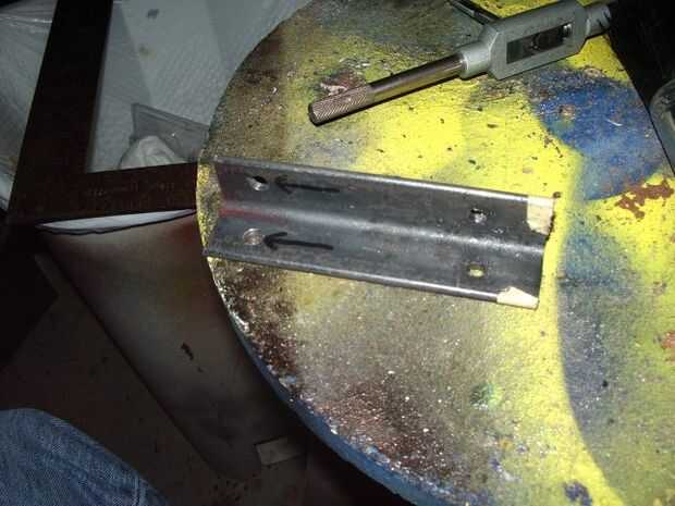 A continuación, hice una perforación de la plantilla de un pedazo de ángulo de hierro para los agujeros que ha perforado en las piernas sería incluso todo el perímetro (Foto 3). Foto 4 muestra cómo se utiliza esta plantilla, y la foto 5 muestra los agujeros perforados en las patas.